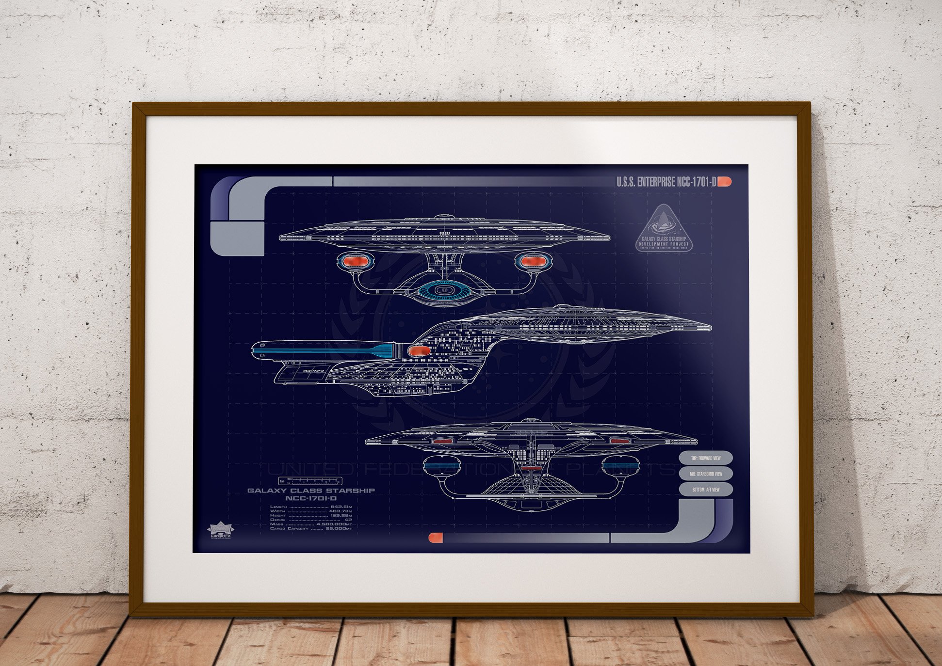 Galaxy Class Starship, Registry NCC-1701-D. Blueprint style image displaying the elevation profiles of the Galaxy class starship; most famously represented by the USS Enterprise, from Star Trek: The Next Generation. Elevation profiles are represented by the Forward, Aft, and Starboard views. Image is white on blue, with red and blue highlighted features. Utopia Planitia project badge is displayed in the upper right side, with tonnage statistics listed.